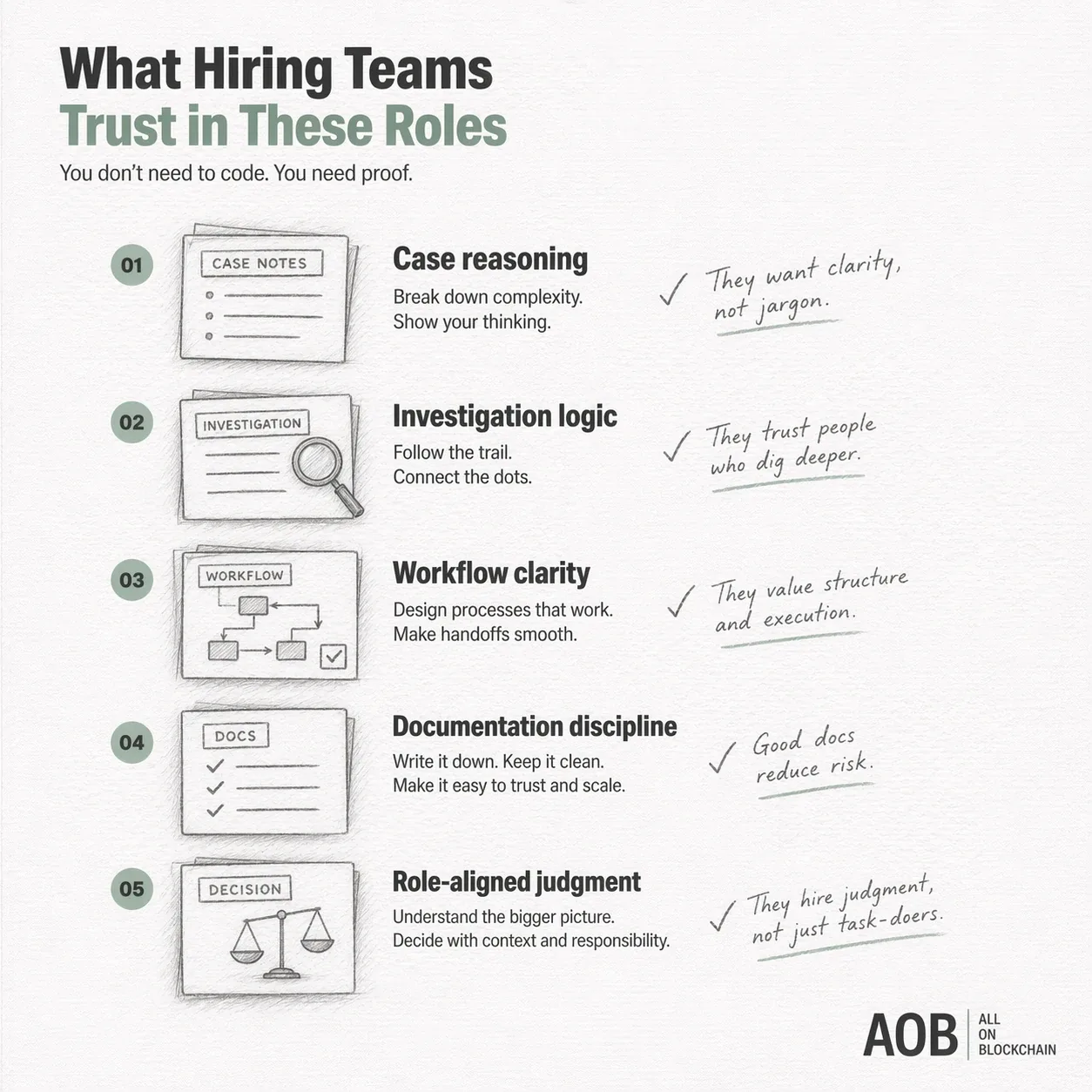 In these roles, hiring teams usually do not trust buzzwords, surface-level interest, or vague claims about wanting to move into Web3. They trust clear reasoning, readable proof, role-specific judgment, and evidence that the person understands how regulated blockchain work actually functions.